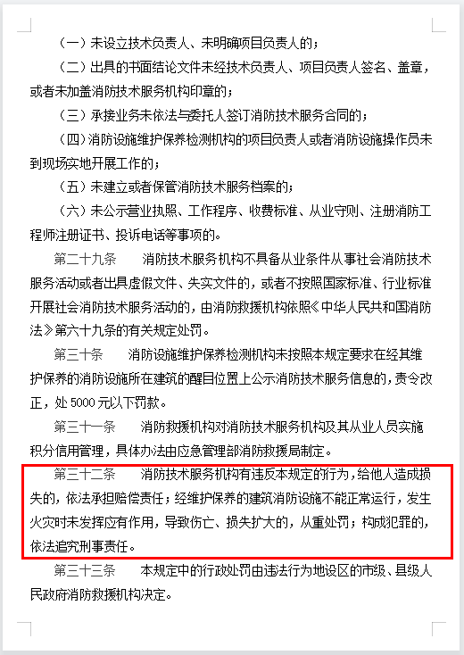 第三十二條 消防技術(shù)服務(wù)機構(gòu)有違反本規(guī)定的行為,給他人造成損失的,依法承擔(dān)賠償責(zé)任;經(jīng)維護保養(yǎng)的建筑消防設(shè)施不能正常運行,發(fā)生火災(zāi)時未發(fā)揮應(yīng)有作用,導(dǎo)致傷亡,損失擴大的,從重處罰;構(gòu)成犯罪的,依法追究行政責(zé)任。
